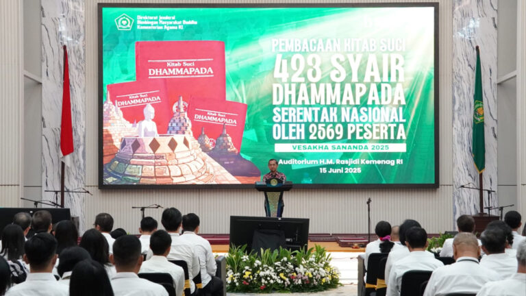 Kilasinformasi.com, Jakarta — Sebanyak 2.569 umat Buddha dari 34 provinsi di Indonesia mengikuti pembacaan Kitab Suci Dhammapada secara serentak pada Minggu (15/6/2025). Acara monumental yang digelar oleh Direktorat Jenderal Bimbingan Masyarakat Buddha Kementerian Agama ini berhasil mencatatkan rekor MURI sebagai pembacaan Dhammapada dengan peserta terbanyak di Indonesia.