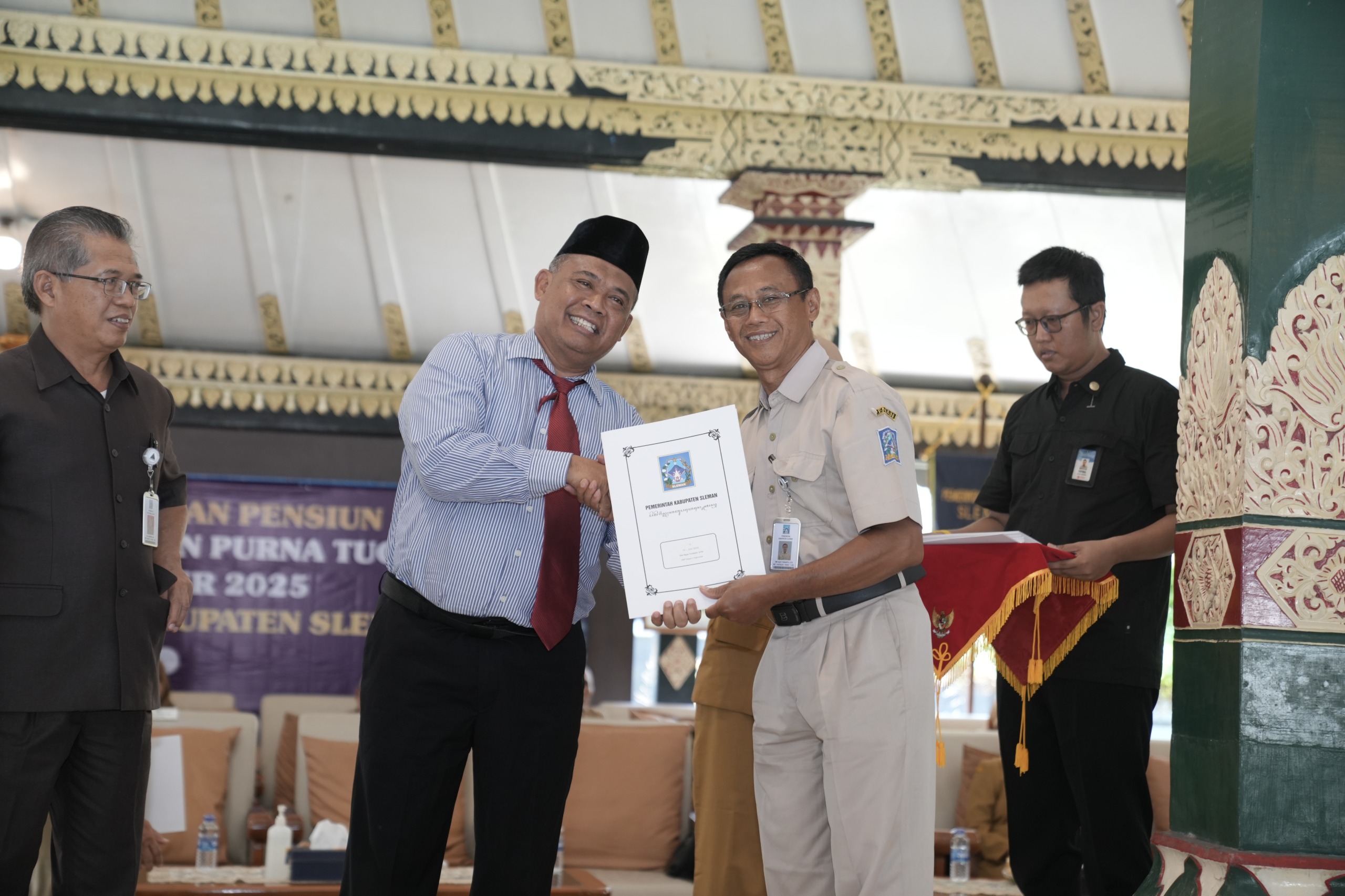 Pemkab Sleman serahkan SK pensiun kepada 232 PNS calon purna tugas periode Juli-Desember 2025. Bupati Harda Kiswaya mengapresiasi dan mendorong mereka untuk terus berkarya dan memberi manfaat pasca-pensiun.