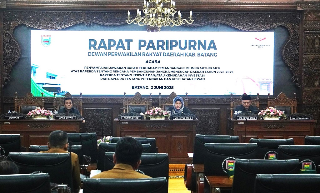 Kilasinformasi.com, Batang, Jawa Tengah — Wakil Bupati Batang Suyono menyampaikan jawaban resmi Pemerintah Kabupaten Batang terhadap pandangan fraksi-fraksi DPRD atas Rancangan Peraturan Daerah (Raperda) Rencana Pembangunan Jangka Menengah Daerah (RPJMD) Tahun 2025–2029. Jawaban tersebut disampaikan dalam Rapat Paripurna di Gedung DPRD Kabupaten Batang, Senin (2/6/2025).